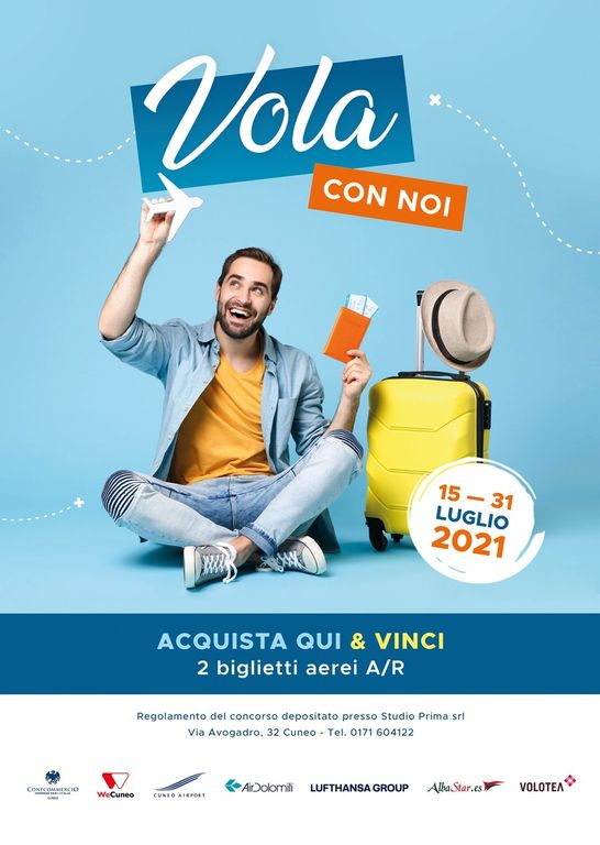 “Vola con Noi” è il concorso che mette in palio voucher validi per voli aerei per due persone, andata e ritorno, con partenza ed arrivo dall’aeroporto di Cuneo-Levaldigi, ideato da Confcommercio Cuneo e WeCuneo, insieme alla GEAC società che gestisce lo scalo cuneese unitamente al contributo delle compagnie aeree che ringraziamo, per festeggiare le riaperture che ci si augura siano definitive.