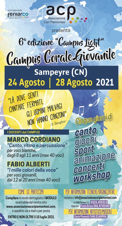 Si terrà anche quest’anno a Becetto di Sampeyre dal 24 al 28 agosto 2021, la 6° edizione del Campus Corale Giovanile organizzato da Associazione Cori Piemontesi. Sotto la direzione artistica del M° Dario Piumatti, educatore insegnante e direttore di coro da ormai 20 anni, vedrà coinvolti bambini e ragazzi dagli 8 ai 20 anni in un’esperienza unica, una vera e propria “vacanza musicale” all’insegna del canto corale, dello svago, gioco animazione e condivisione.
