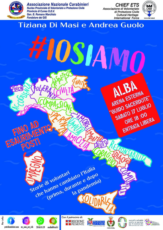 "#IOSIAMO. Storie di volontari che hanno cambiato l’Italia (prima, durante e dopo la pandemia)", libro fresco di stampa e scritto da Tiziana Di Masi e Andrea Guolo (Edizioni San Paolo), sarà presentato per la prima volta in Piemonte nell’evento speciale organizzato ad Alba dall’Associazione Nazionale Carabinieri e da Chief Ets, con la presenza delle maggiori istituzioni e delle principali associazioni di volontariato. L’evento è patrocinato da Regione Piemonte, Provincia di Cuneo, Città di Alba, Csv Cuneo e Consulta Comunale Volontariato.