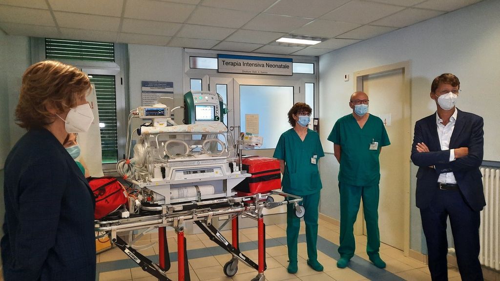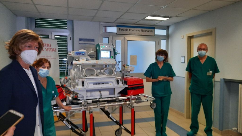 Nadia Castellino, responsabile della Struttura semplice del Trasporto: “Tutto questo sistema rappresenta un'unità mobile di rianimazione. C'è l'incubatrice che scalda il bimbo e lo tiene alla giusta temperatura, il ventilatore che aiuta nella respirazione, il monitor parametri vitali, delle pompe infusionali, e due zaini con tutto l'occorrente per fare procedure anche d'urgenza sul bambino. In questo modo siamo completamente autonomi. L'incubatrice viene poi caricata su un'ambulanza predisposta per il trasporto neonati. Questo ventilatore può garantire anche il trasporto del lattante, dopo il primo mese di vita e fino a sei mesi, e fino a 6 kg di peso”.