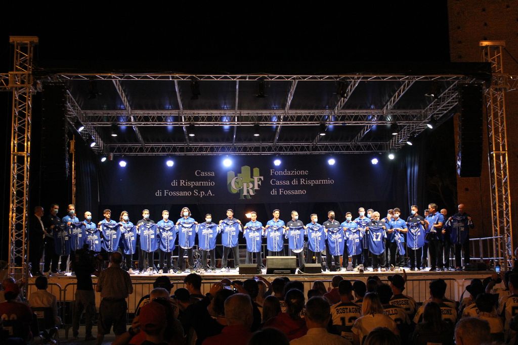 Nella serata di ieri, in piazza Castello, sono state presentate le casacche con le quali il roster di giocatori affonterà l’imminente competizione. Applausi scroscianti hanno accompagnato la salita sul palco degli atleti, presentati uno ad uno e del loro allenatore, incitati anche dalla squadra fossanese, presente in toto nelle prime file.