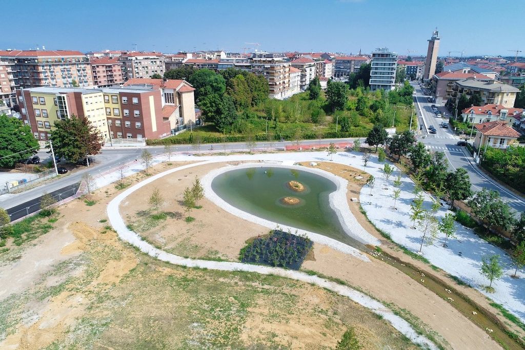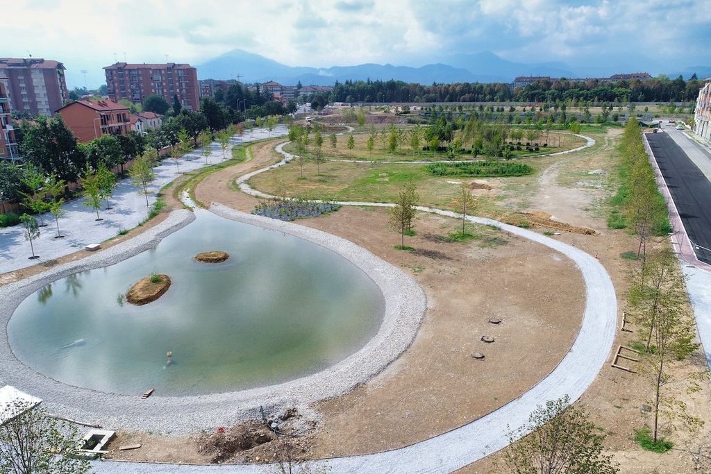 Già ben visibili le forme principali del futuro parco. Sono stati completati gli scavi per il laghetto naturalistici già riempito con l'acqua, e che presto vedrà l'installazione delle Phragmites australis e delle Typha latifolia per la sua fitodepurazione, e sono perfettamente definiti il fosso e i percorsi pedonali adiacenti; sono poi iniziati gli scavi per realizzare gli specchi d'acqua con ciottoli di fiume, i lavori di realizzazione della zona attrezzata dove sorgeranno i campi sportivi, le aree fitness e quelle dedicate ai bambini e quelli per il frutteto didattico.