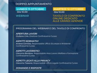 Negli appuntamenti di lunedì 11 e martedì 12 ottobre, dopo l’apertura dei lavori a cura di Giuliana Cirio, direttore di Confindustria Cuneo, vi sarà l’esame degli aspetti normativi proposta da Andrea Corniolo, responsabile dell’Ufficio Sicurezza e Ambiente di Confindustria Cuneo, seguiranno gli aspetti lavoristici analizzati di Giacomo Bordone, responsabile dell’Area Lavoro Welfare e Formazione di Confindustria Cuneo, e quelli legati alla privacy affrontati da Giacomo Tassone, responsabile dell’Ufficio legale di Confindustria Cuneo. A parlare delle previsioni sui tempi della terza dose di vaccino per i lavoratori sarà Bartolomeo Griglio, vicedirettore dell’Assessorato alla sanità della Regione Piemonte.