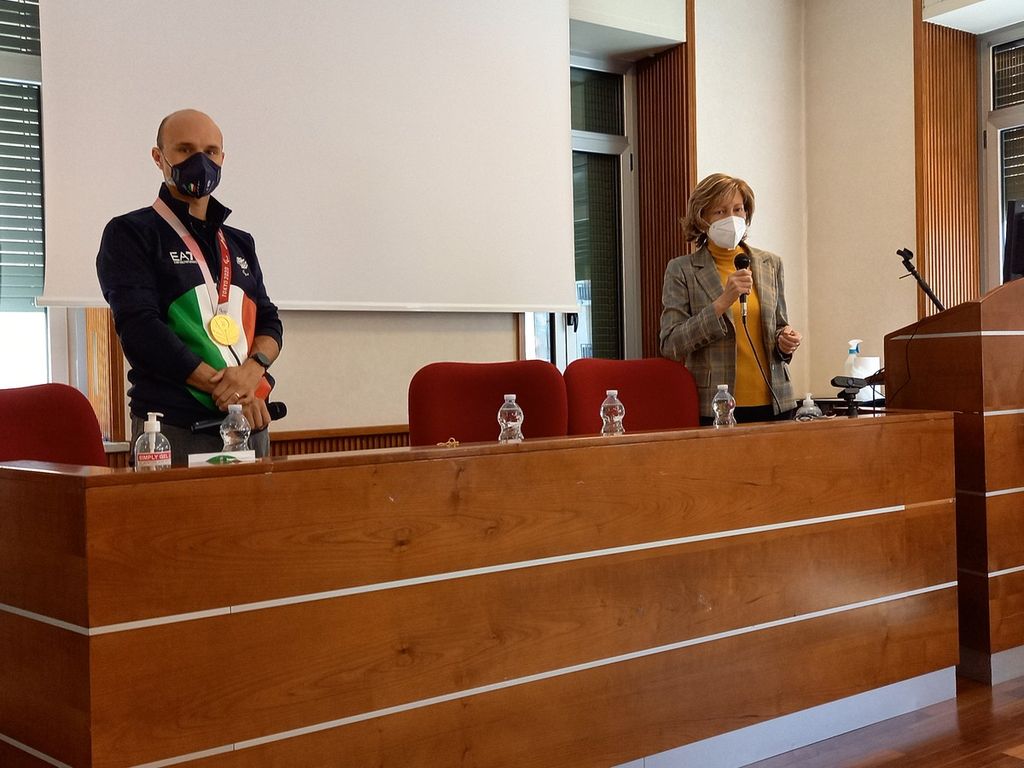 Parole di Diego Colombari - atleta cuneese balzato agli onori della cronaca nel corso degli ultimi Giochi Paralimpici di Tokyo per aver vinto la medaglia d'oro nella Team Relay - oggi (lunedì 11 ottobre) protagonista di un incontro con lo staff medico nella sala conferenze dell'ospedale Santa Croce e Carle di Cuneo.