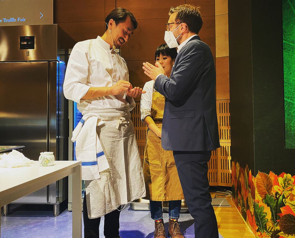 Il piatto preparato e servito ai commensali in sala Fenoglio è stato il Chawanmushi con Tartufo Bianco d’Alba, un piatto caldo a base di uova al vapore con brodo Dashi che per il gusto e la qualità entrerà a far parte della collezione museale del Museo del Tartufo di Alba.
