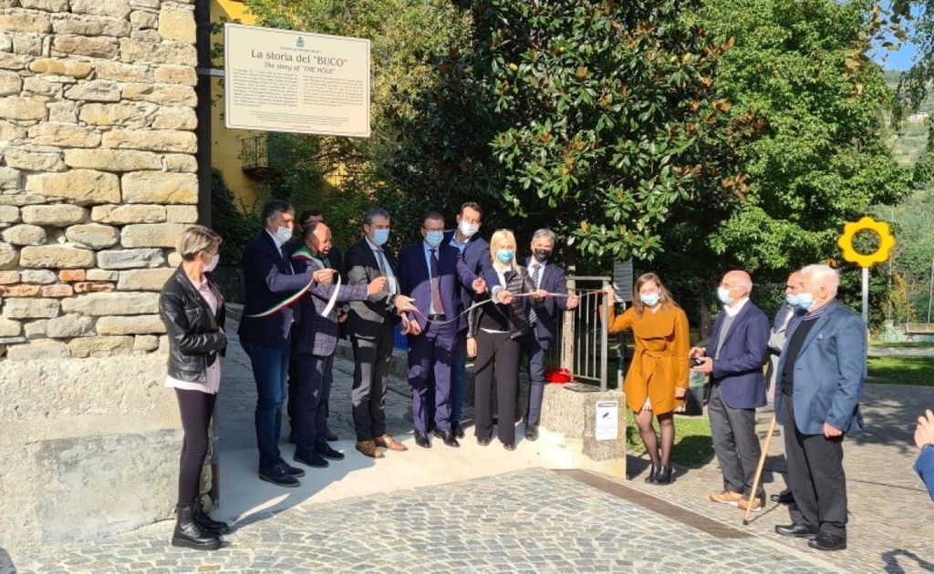 Dopo aver percorso con un lungo racconto, le varie fasi della ricostruzione, menzionando tutti coloro che hanno contribuito ai lavori, si è proceduto alla scoperta del mosaico con la presenza del suo sponsor Gianni Martini, titolare della Fratelli Martini. Si è passati all'inaugurazione della mostra fotografica con la scoperta del cartello informativo, presenti i titolari delle tre ditte che hanno eseguito i lavori, ovvero la Colombano di Rocchetta, la Boggeri Andreino di Arquata Scrivia e la Cauda Strade di Pralormo; quindi il taglio del nastro da parte delle autorità presenti