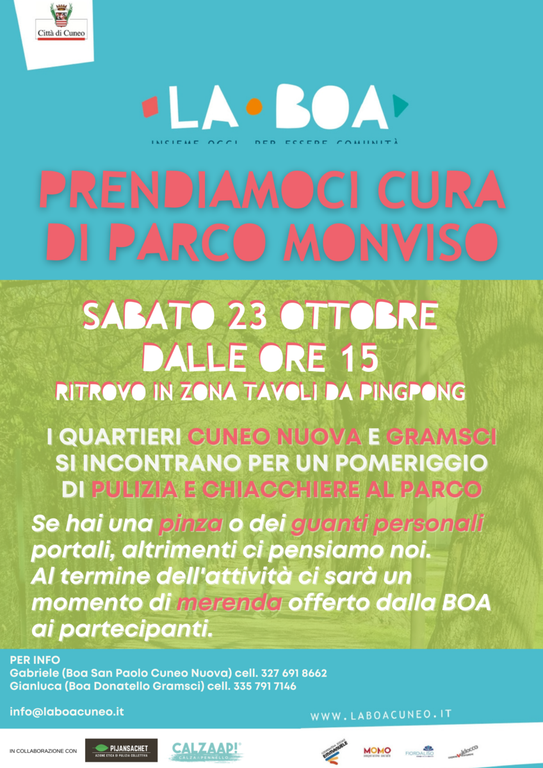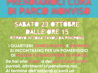 LE BOE dei quartieri Gramsci e Cuneo Nuova invitano tutti i cittadini e le cittadine a un pomeriggio di pulizia e chiacchiere al parco. Il ritrovo è per sabato 23 ottobre alle ore 15 dal parco Monviso, nella zona dove ci sono i tavoli da ping pong. Al termine della pulizia ci sarà un momento di merenda offerto dalla BOA ai partecipanti, durante il quale ci sarà la possibilità anche di scambiarsi idee e opinioni su come vivere al meglio il parco.