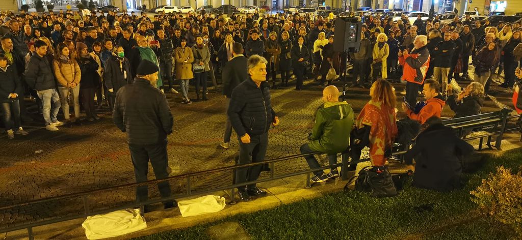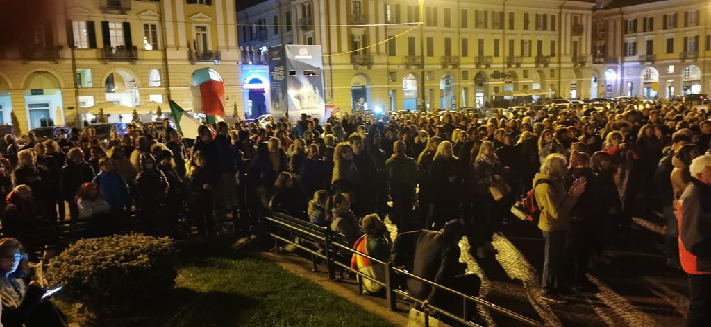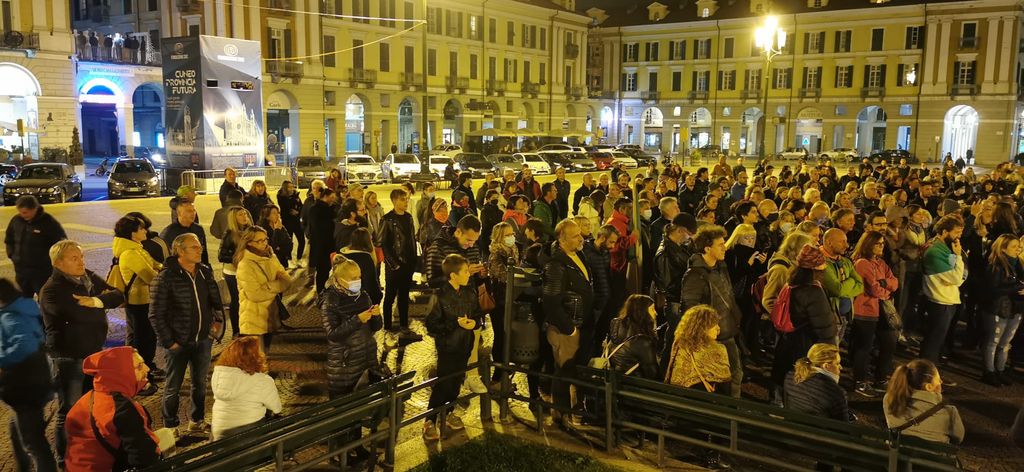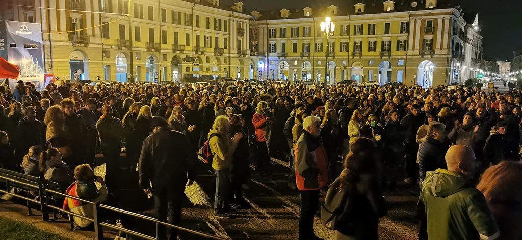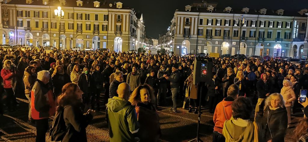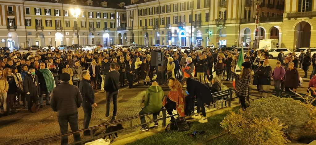 Si è parlato della situazione dei portuali di Trieste e delle nuove strategie di "resistenza passiva" da attuare nei prossimi mesi ieri sera, in piazza Galimberti a Cuneo, durante la nuova maniestazione del coordinamento provinciale free vax-no green pass.