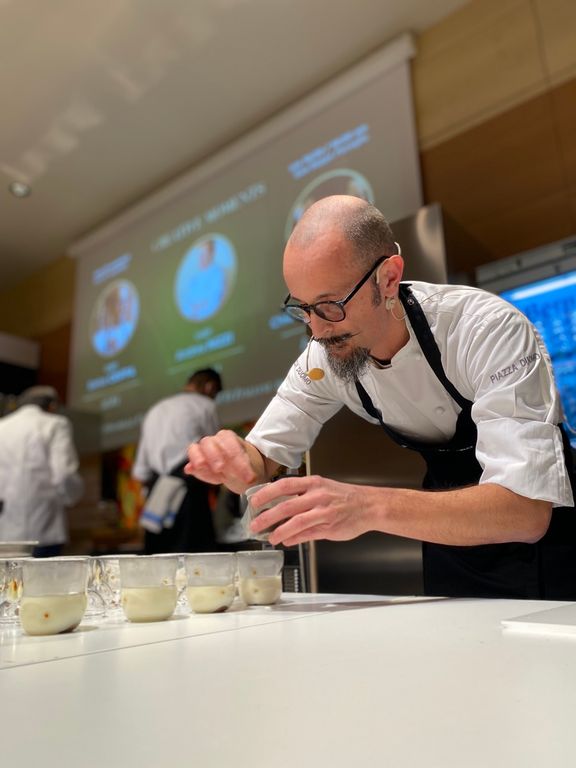 Enrico Crippa (chef tre stelle Michelin di Alba) ha proposto “La terra: crema di patate, lapsang souchong”.