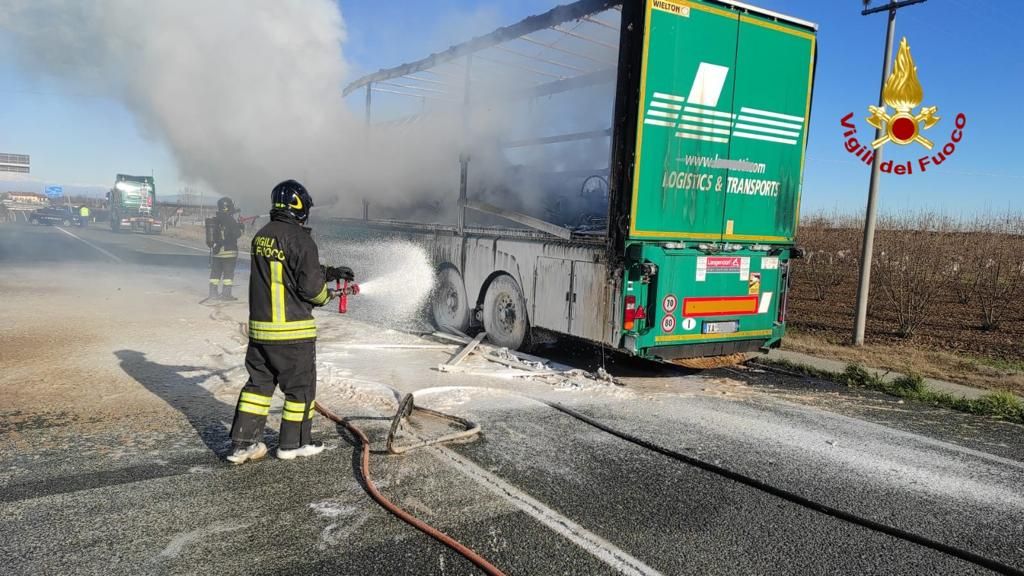 A fuoco un autoarticolato, oggi (3 dicembre) nella tarda mattinata, lungo la tangenziale est di Saluzzo.