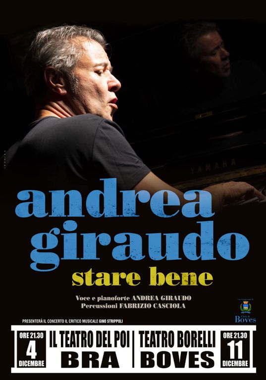 Andrea Giraudo ha appena concluso due serate importanti del suo 'Stare bene tour' che lo hanno visto potagonista il 4 dicembre a Bra al Teatro del Poi e l’11 dicembre al Teatro Borelli di Boves accompagnato alle percussioni da Fabrizio Casciola. Andrea è un artista difficilmente catalogabile, infatti, è un bluesman, ma anche un pianista di razza, un compositore e un cantautore. La sua musica ha groove, un'impronta soul, ma i suoi brani si inseriscono perfettamente nella grande tradizione italiana, come quella ad esempio di Conte, Battisti e Jannacci.