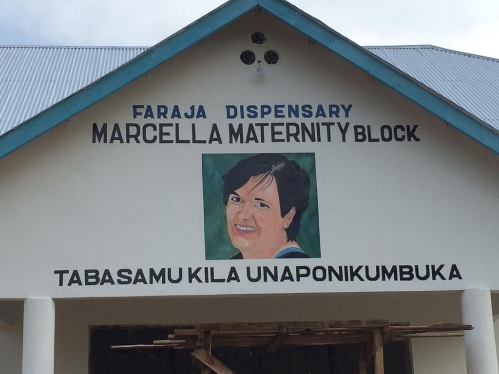 Sulla facciata ci sono: la scritta “Faraja dispensary- Marcella maternity block” e un affresco del volto di Marcella realizzato da uno studente della scuola.