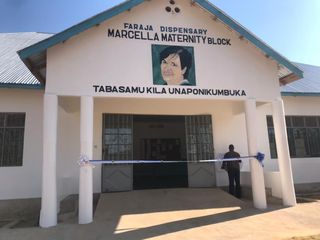 Sulla facciata ci sono: la scritta “Faraja dispensary- Marcella maternity block” e un affresco del volto di Marcella realizzato da uno studente della scuola.