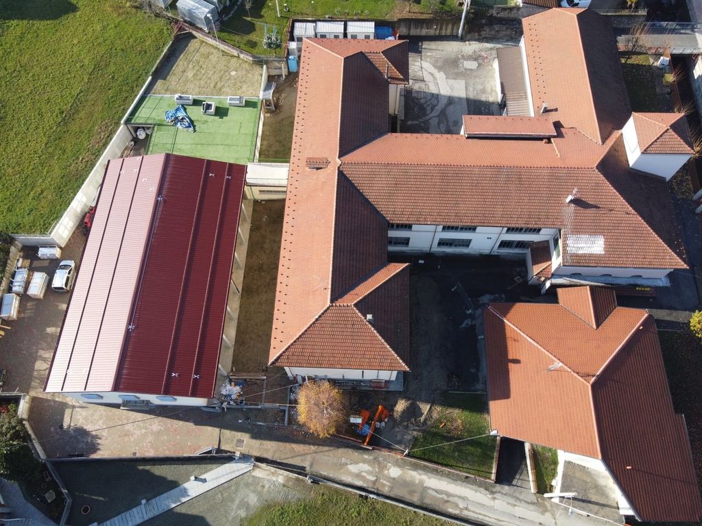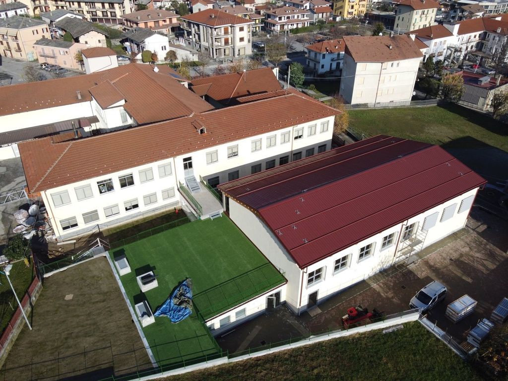 I locali hanno una copertura a tetto piano opportunamente impermeabilizzata, al di sopra della quale è stato realizzato un giardino pensile in erba sintetica per lo sfruttamento da parte dei ragazzi durante la ricreazione.