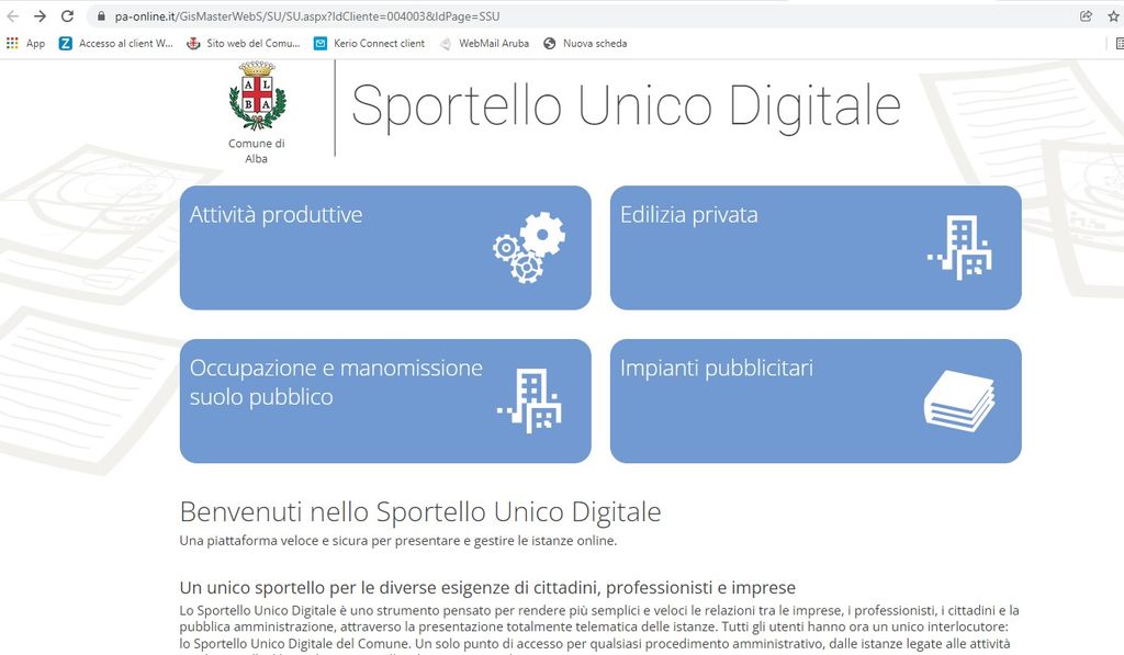 Si accede dall’home page del sito del Comune. L’indirizzo è: https://www.pa-online.it/GisMasterWebS/SU/SU.aspx?IdCliente=004003&IdPage=SSU