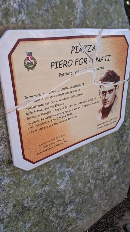 Il Partigiano Piero Fortunati è morto giovanissimo ed è stato fucilato a Frabosa Sottana, frazione Miroglio, nel dicembre del 1944, come riporta la dicitura scritta sulla targa dedicata a questo giovane patriota.
