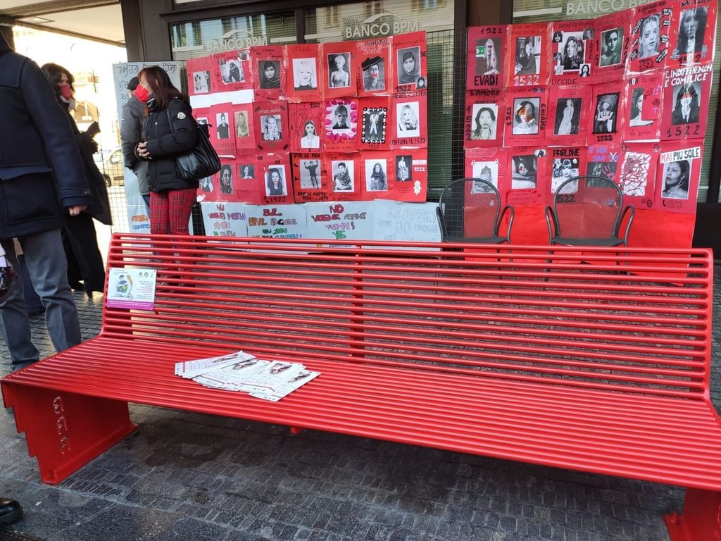 Sotto l’auspicio di un cambio di rotta è stata posta la panchina rossa, colore della passione e del sangue, a simboleggiare la lotta contro un atto barbaro e meschino, ma anche totem di solidarietà verso le vittime di violenza. Come le fotografie appese ai tabelloni alle sue spalle, per ricordare mogli, madri e giovani che non ci sono più, portate via da chi aveva giurato di proteggerle.