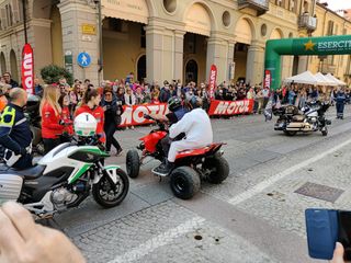 Immancabile un saluto da parte del presidente della Fondazione Crf Antonio Miglio, mentre un motoraduno non avrebbe potuto essere tale se non con la presenza allegra, autorevole e "santa" di Don Biker, al secolo Don Mario Dompè, storica autorità religiosa della manifestazione, che, prima della benedizione di rito, è stato coinvolto suo malgrado, da passeggero, in una serie di evoluzioni sul quad.