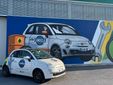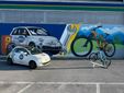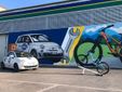 A sinistra c'è una Fiat 500 e a destra una bici elettrica immersa nel verde, con al centro una chiave inglese.