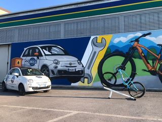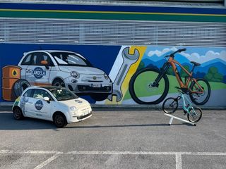 A sinistra c'è una Fiat 500 e a destra una bici elettrica immersa nel verde, con al centro una chiave inglese.