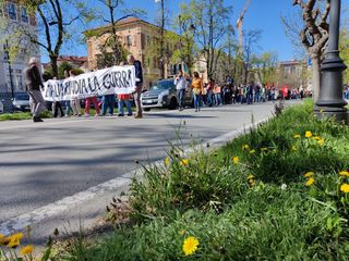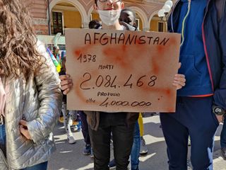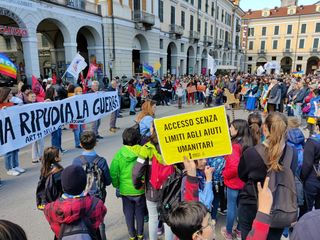 Partenza e qualche tappa per ricordare i numeri delle vittime delle ultime 30 guerre nel mondo, in piazza Europa e poi in corso Dante. Uno stop anche in piazza Galimberti, dove c'è stato un minuto di silenzio e dove gli scout hanno distribuito dei foglietti con le parole da cancellare e non usare più. Parole di violenza e morte.