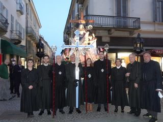 Quindi, il gonfalone dell’Arciconfraternita della Misericordia, con il fiume nero delle Consorelle e dei Confratelli, chiuso dai Rettori, Alessio Bossolasco, Marina Tibaldi e Paolo Tibaldi, a precedere il gruppo ligneo di statue, rappresentante la Madonna ferita nel cuore da sette spade, che sorregge il corpo del Figlio, confortata da un angelo.