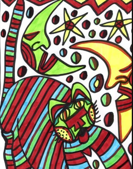 Molto interessante è la personale dell’artista Buròt Francesco Russo nella Sala Consiliare, per rendere il nobile locale storico del Marchesi Cordero di Pamparato più elegante e ammirevole. Il poliedrico uomo d’arte monregalese, già noto quale scultore in pietra e legno, nonché autore di olii e acquarelli, come pure di varie forme di grafica e financo di fotografia d’arte, presenta ora una nuova sua creazione: curiose allegorie in pennarelli policromi. Remigio Bertolino, critico d’arte sopraffino, a tal proposito precisa” nel nero periodo del confinamento a causa della pandemia, Buròt non è rimasto inerte, ma ha cercato di vedere oltre la desolazione che si stendeva al di là della finestra dello studio. Si è immerso in un microcosmo di sensazioni cromatiche, di immagini rutilanti, fantasmagoriche. Ha cercato di evadere dal carcere dell’isolamento, attraverso il gioco dell’invenzione continua. In molte immagini traspaiono soli e lune antropomorfiche, farfalle e gufi, in un a sorta di arcana contiguità. L’artista opera ibridazioni tra vari animali. Esemplare è l’immagine del misterioso uccello dalla magica corona lunare.