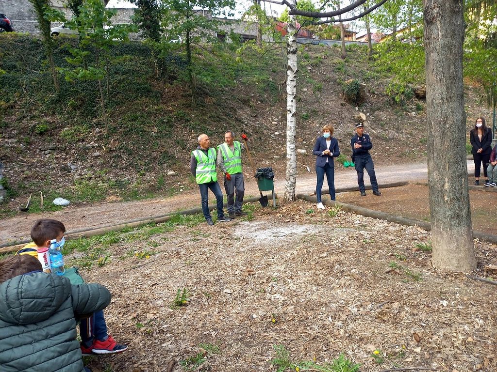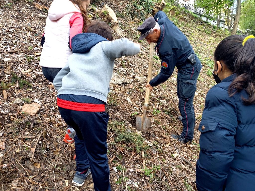 La consapevolezza, l'importanza della natura e in modo particolare degli alberi. Dopo alcune letture tratte dal libro "Storia di una gabbianella e del gatto che le insegnò a volare" di Luis Sepúlveda, con attenzione i bambini hanno ascoltato la spiegazione del comandante Mauro Castelli sulle varie tipologie di piante, aiutando poi entusiasti nella loro messa nel terreno.