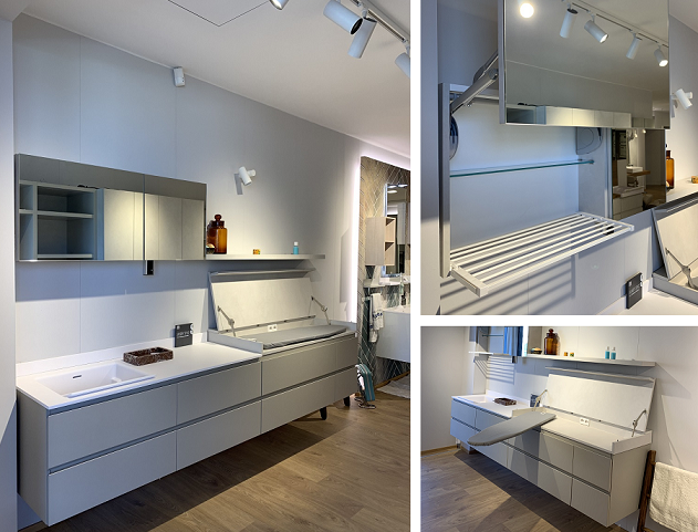 Arreda la zona bagno con elementi particolari: l’asse da stiro estraibile si nasconde all’interno dello spessore del piano Cover, l’asse ruota di 90° ed è corredato, all’interno dell’alloggiamento, di una coppia di prese per un facile e pratico utilizzo del ferro da stiro. L’elemento stendino arricchisce il pensile con l’aggiunta specchio.