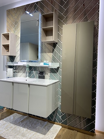 Bagno Rivo con moduli sospesi caratterizzati da gole inclinate a 45°, i vani a giorno e i pensili e piano top sp. 10cm.