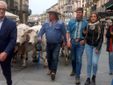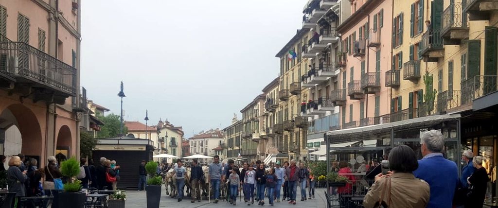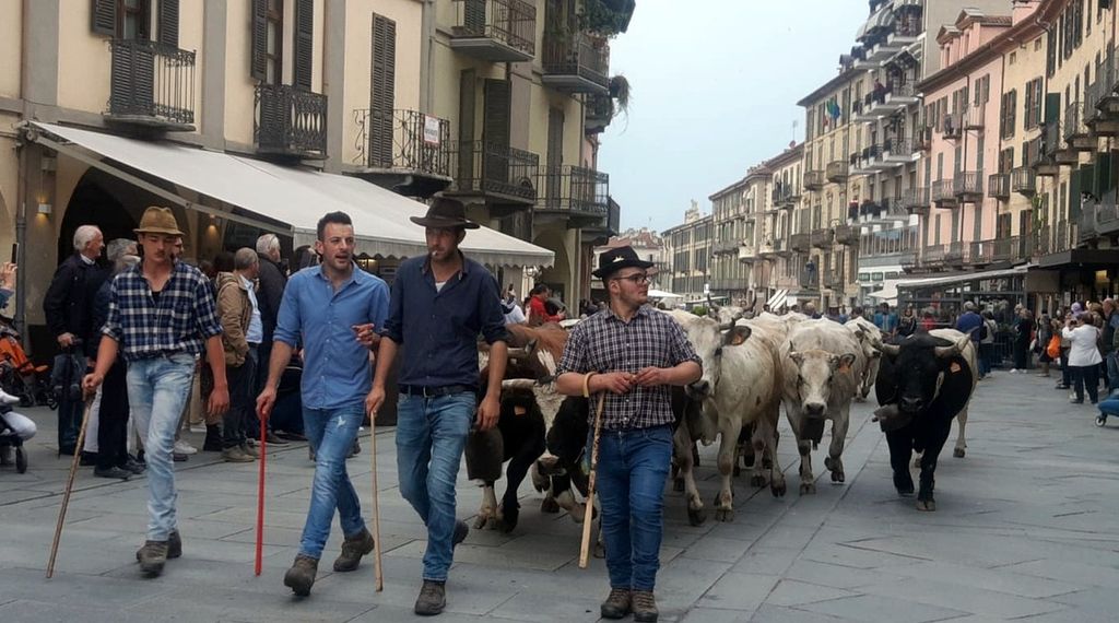 Mandrie di mucche, una novantina di animali, guidate dai loro margari dal piglio sicuro e fiero, hanno fatto irruzione nel pieno pomeriggio di ieri, sabato 30 aprile, prendendosi la scena tra palazzi e negozi, rinnovando con suoni, colori, gestualità, i riti tipici della campagna e della montagna e quelli secolari della migrazione per la stagione estiva, dalle stalle della pianura agli alpeggi.