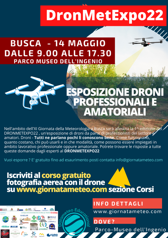 Nell'ambito della Giornata della Meteorologia a Busca sarà allestita la prima edizione del DRONMETEXPO22 , un'esposizione di droni da parte di professionisti del settore e amatori.