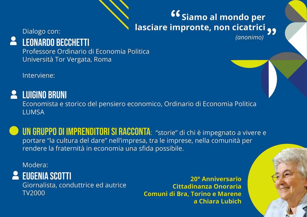 Per scoprirlo saremo aiutati da Leonardo Becchetti, Professore Ordinario di Economia Politica Università Tor Vergata, Roma, fondatore di NEXT, Nuova Economia per tutti, direttore del FESTIVAL dell’ECONOMIA CIVILE di Firenze, che si svolgerà a Firenze dal 16 al 18 settembre 2022 e da Luigino Bruni, Economista e storico del pensiero economico, Ordinario di Economia Politica alla LUMSA, promotore e cofondatore insieme a Stefano Zamagni della SEC, Scuola di Economia Civile, già coordinatore internazionale del progetto Economia di Comunione, responsabile scientifico di EoF, Economy of Francesco, che si svolgerà ad Assisi dal 22 al 24 settembre 2022.