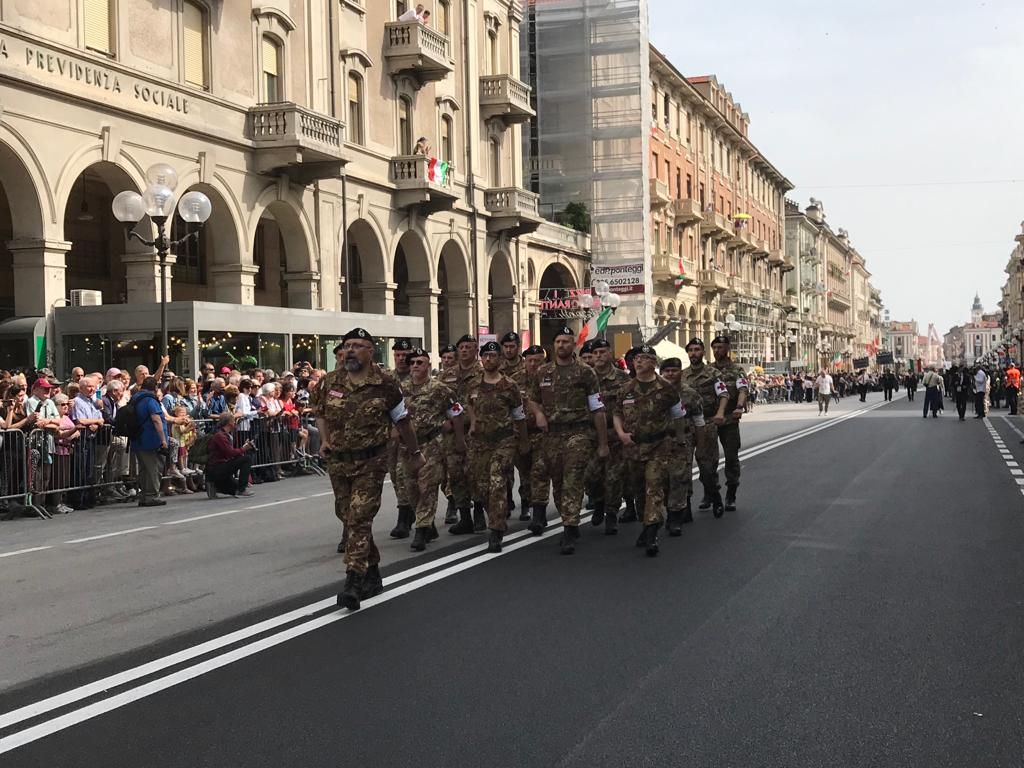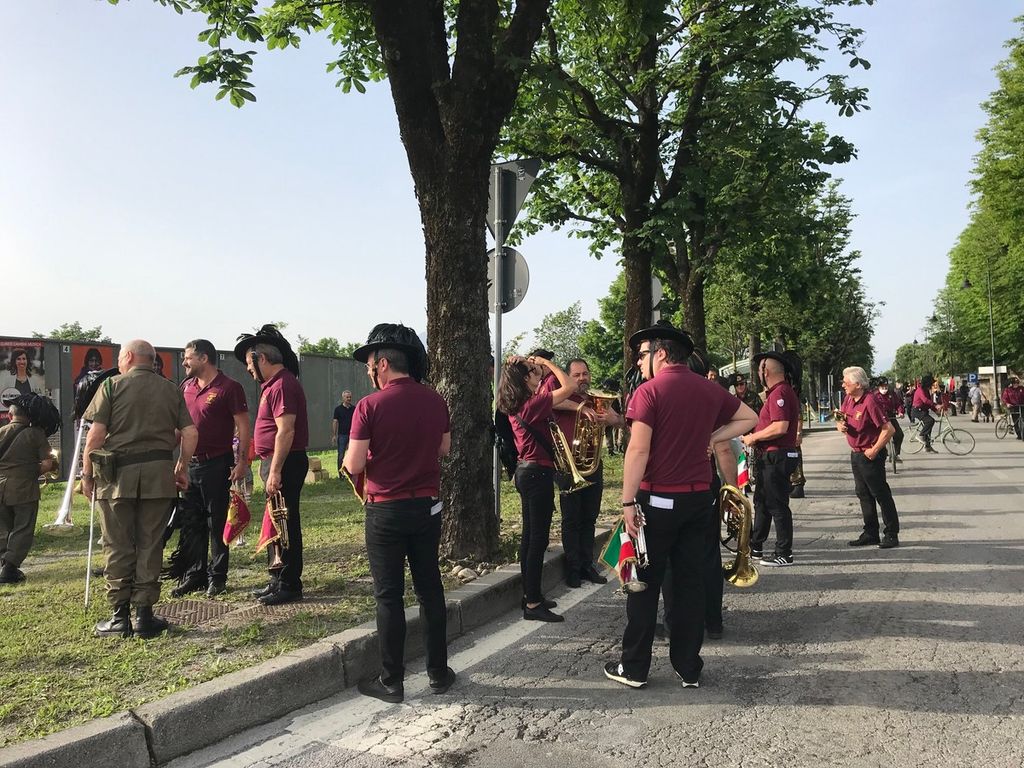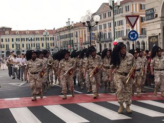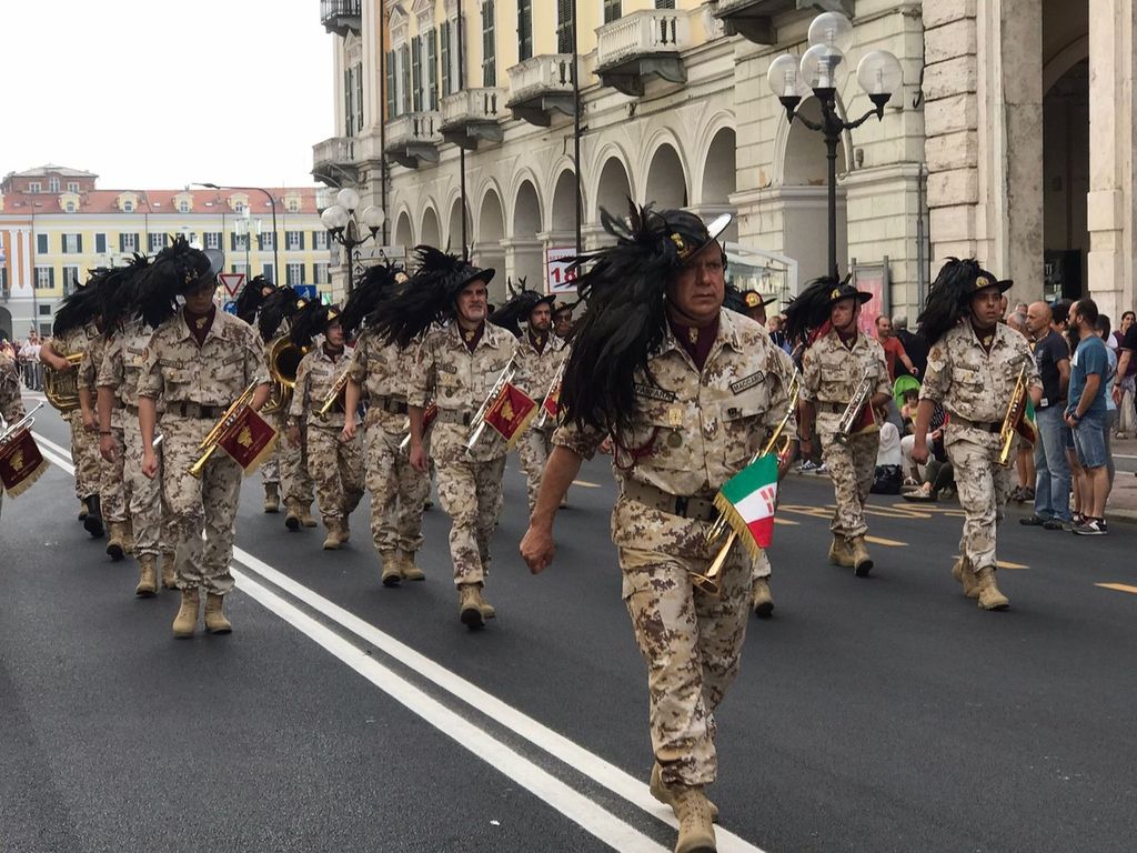 Sei fanfare hanno battuto il passo agli scaglioni dagli spalti. Il primo ha visto protagonista la banda di Villafalletto, i gonfaloni degli enti locali e delle amministrazioni locali del cuneese; il secondo e l'ultimo scaglione hanno visto impegnate le forze armate operative, il terzo il Medagliere nazionale e la fanfara dei veterani di Chieri trasportati sui mezzi militari. Dal quarto al sesto scaglione i fanti piumati.
