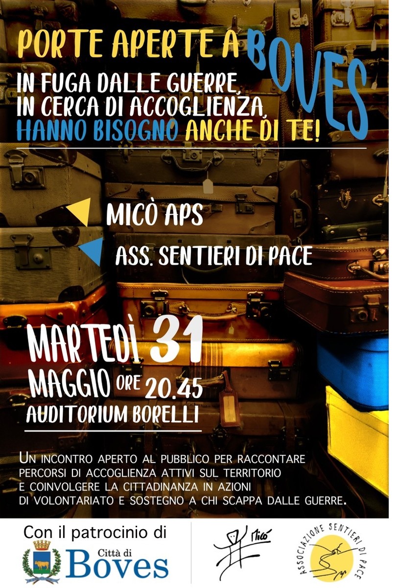 All’auditorium Borelli di Boves, martedì 31 maggio alle ore 20.45, l’associazione MiCò APS organizza un incontro aperto al pubblico per raccontare i percorsi di accoglienza attivi sul territorio rivolti ai profughi ucraini e per coinvolgere la cittadinanza in azioni di volontariato e sostegno.