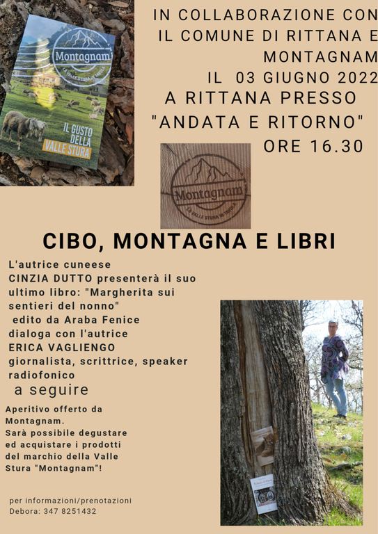 L'unione tra il buon cibo, servito in montagna, accompagnato dalla presentazione dei libri dell'autrice cuneese Cinzia Dutto darà a tutti i partecipanti la possibilità di conoscere un po' della bellissima Valle Stura e della sua storia, nel borgo alpino di Rittana presso "Andata e Ritorno".