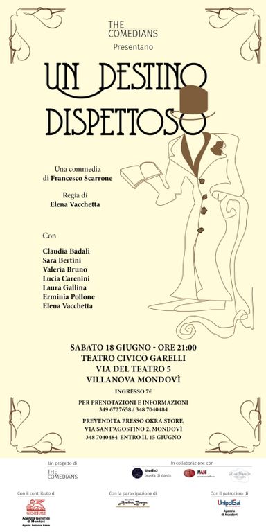 "The comedians" portano in scena "Il destino dispettoso" una commedia di Francesco Scarrone, con Elena Vacchetta (anche alla regia), Claudia Badalì, Sara Bertini, Valeria Bruno, Lucia Carenini, Laura Gallina, Erminia Pollone.