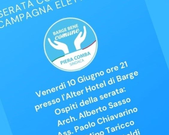 Stasera, venerdì 10 giungo alle ore 21 si svolgerà presso l’Alter Hotel di Barge la serata conclusiva della campagna elettorale di Piera Comba, candidata sindaco per la città di Barge.