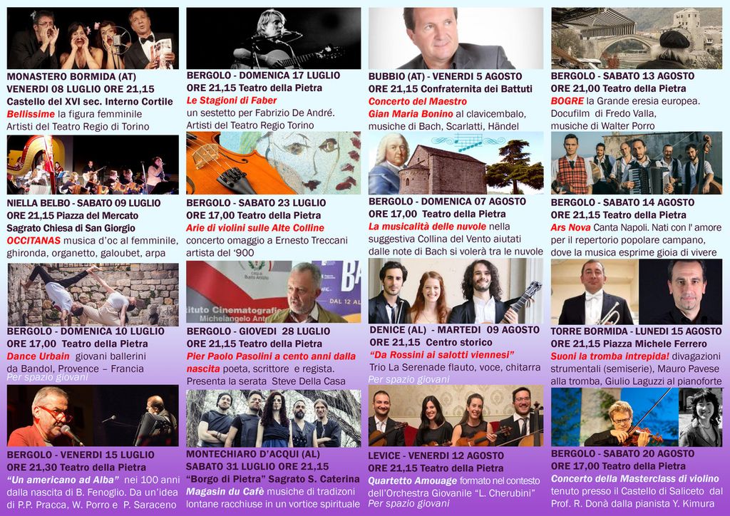Il Cartellone è vario, formazioni del Teatro Regio di Torino ,dell’Orchestra Sinfonica della RAI, spazio a molti gruppi di giovani musicisti. Folk della vera Napoli. Non è da dimenticare che sarà proiettato anche il docufilm “BOGRE” con la presenza del regista e del compositore delle Musiche, che ricordo sono state scritte nell’atmosfera magica del Borgo di Pietra. Saranno ricordati gli l’anniversari di B. Fenoglio e Pier Paolo Pasolini.