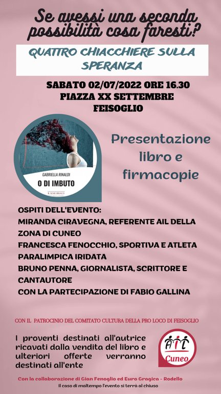 Il 2 luglio alle ore 16.30, a Feisoglio, si terrà una grande iniziativa a scopo benefico. L'evento non sarà solo una semplice presentazione di "O di imbuto", romanzo di Gabriella Rinaldi edito da il Seme Bianco, ma una piccola grande festa tra amici che hanno avuto le loro "seconde possibilità", e che hanno voglia di parlarne con chi vorrà partecipare.