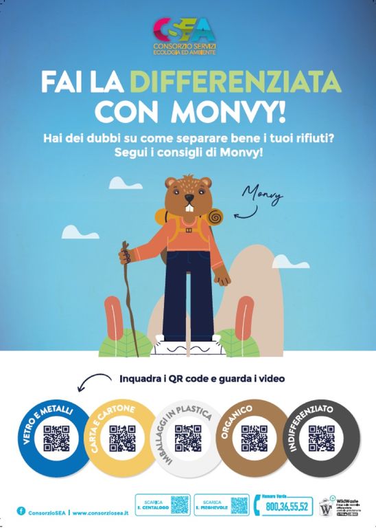 “Monvy” è protagonista di sei video animati, di durata breve e multilingua, visibili scansionando un QR code e visibili anche sul canale Youtube del Consorzio: basta un semplice click per imparare a fare bene la raccolta differenziata eliminando ogni dubbio su dove buttare ogni rifiuto. Con piccoli accorgimenti, separare correttamente quello che non ci serve più diventa facile e immediato. I video di “Monvy” saranno diffusi nelle aree turistiche anche per agevolare i turisti nella corretta separazione dei rifiuti, oltre che in occasione degli eventi cittadini a supporto dei punti di raccolta dei rifiuti, e negli uffici comunali del territorio.