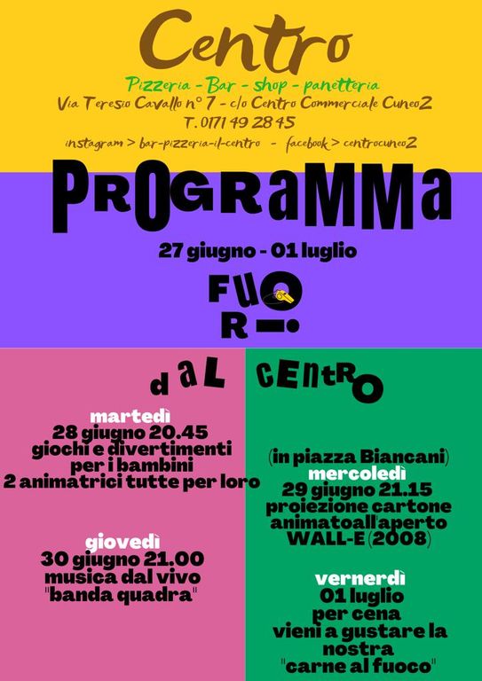 Oltre ai concerti con musica dal vivo, “Il Centro” di Cuneo ha deciso di dedicare tutti i martedì di luglio ai bambini mettendo a disposizione delle famiglie due animatrici che faranno giocare i nostri figli di età 5-10 anni dalle ore 20:45 alle ore 22:00.
