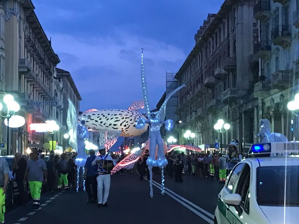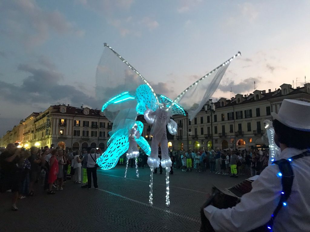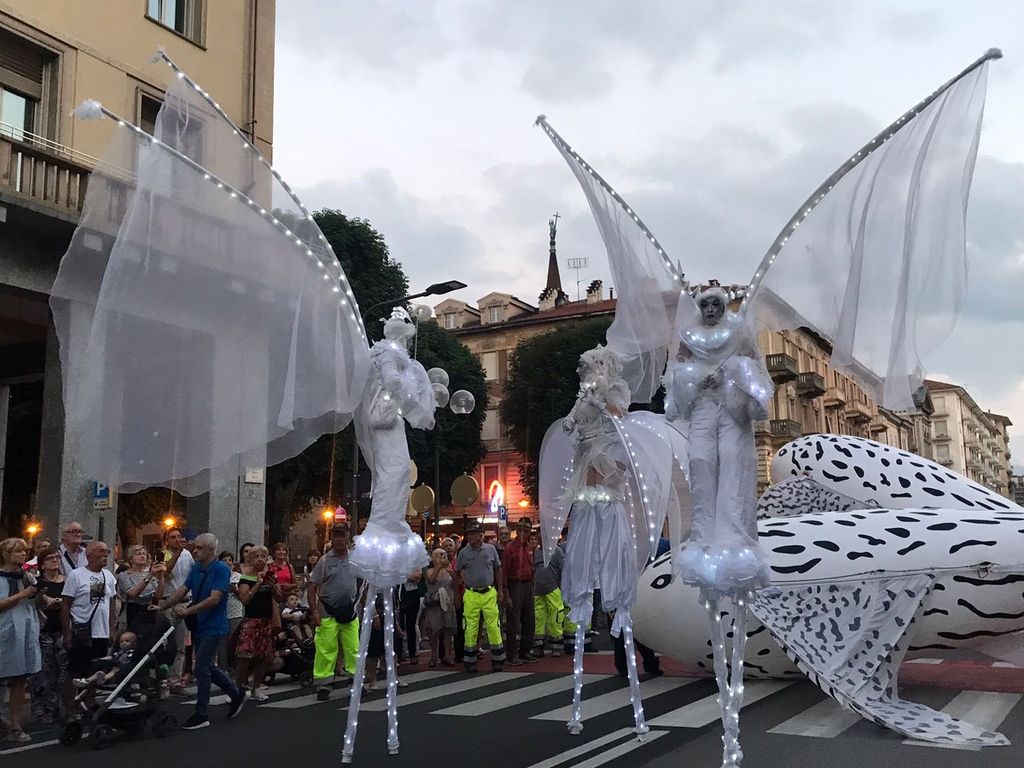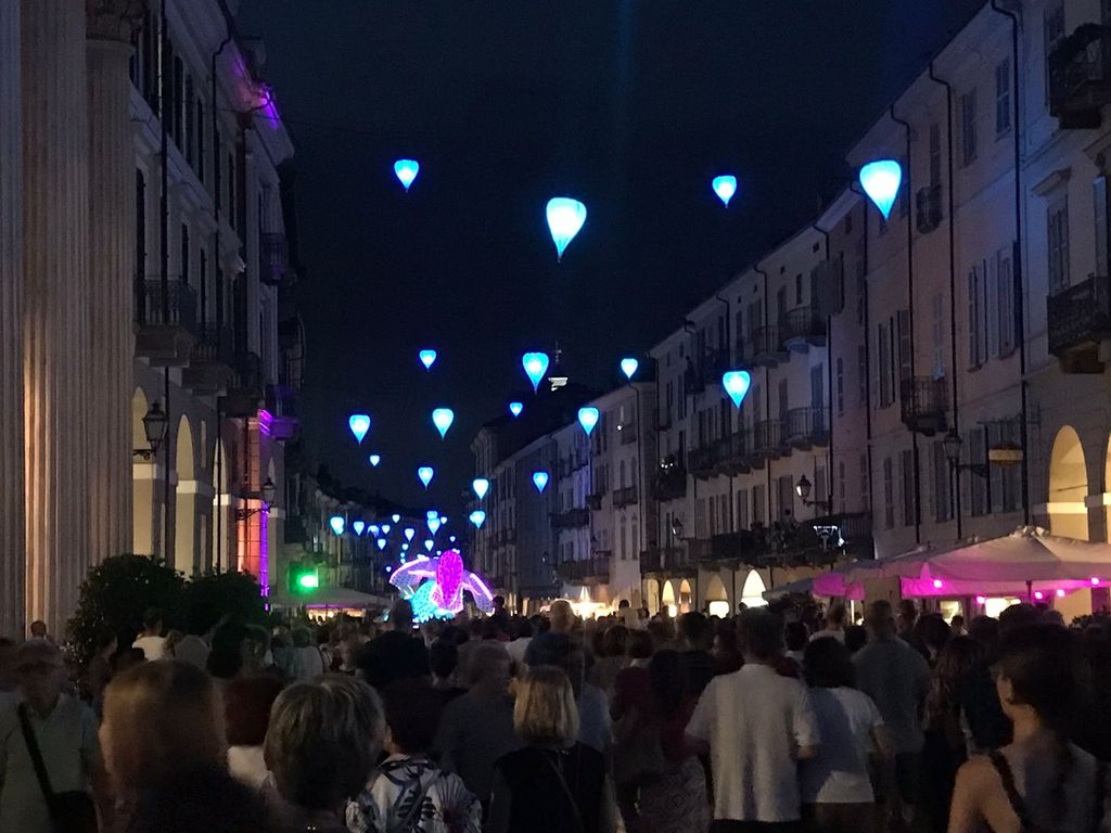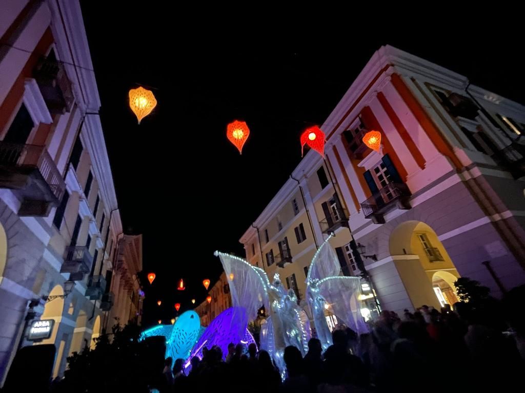 Suggestivo lo spettacolo luminoso itinerante, messo in scena dal gruppo di artisti “Porté par le Vent” accompagnato da musica dal vivo e già protagonista della Festa delle Luci di Lione, partito da Corso Dante per arrivare fino in piazza Galimberti e poi in via Roma.