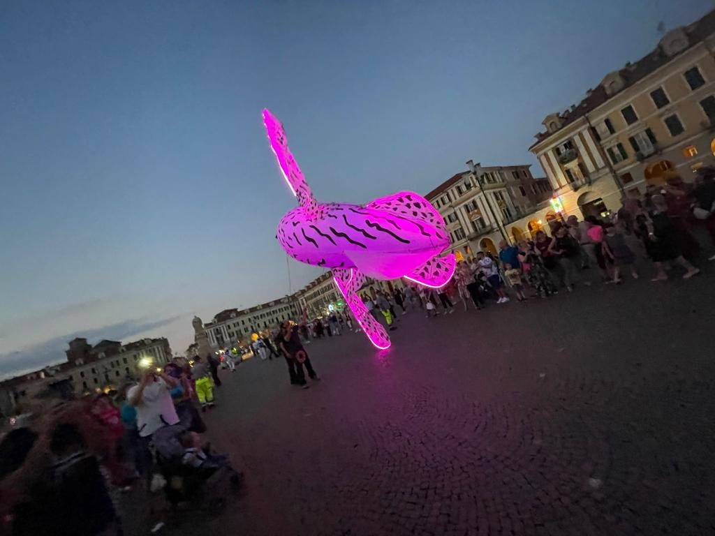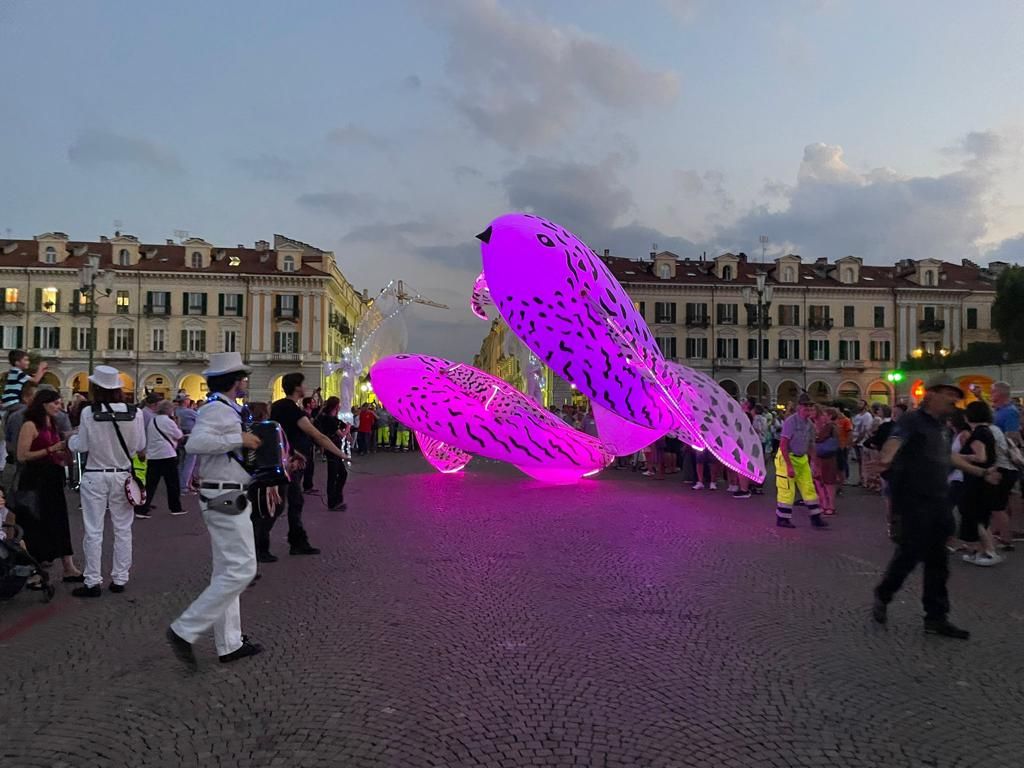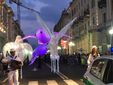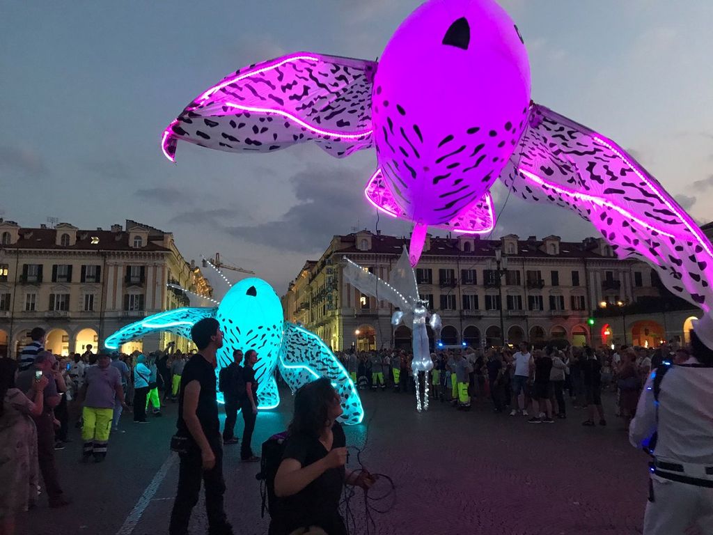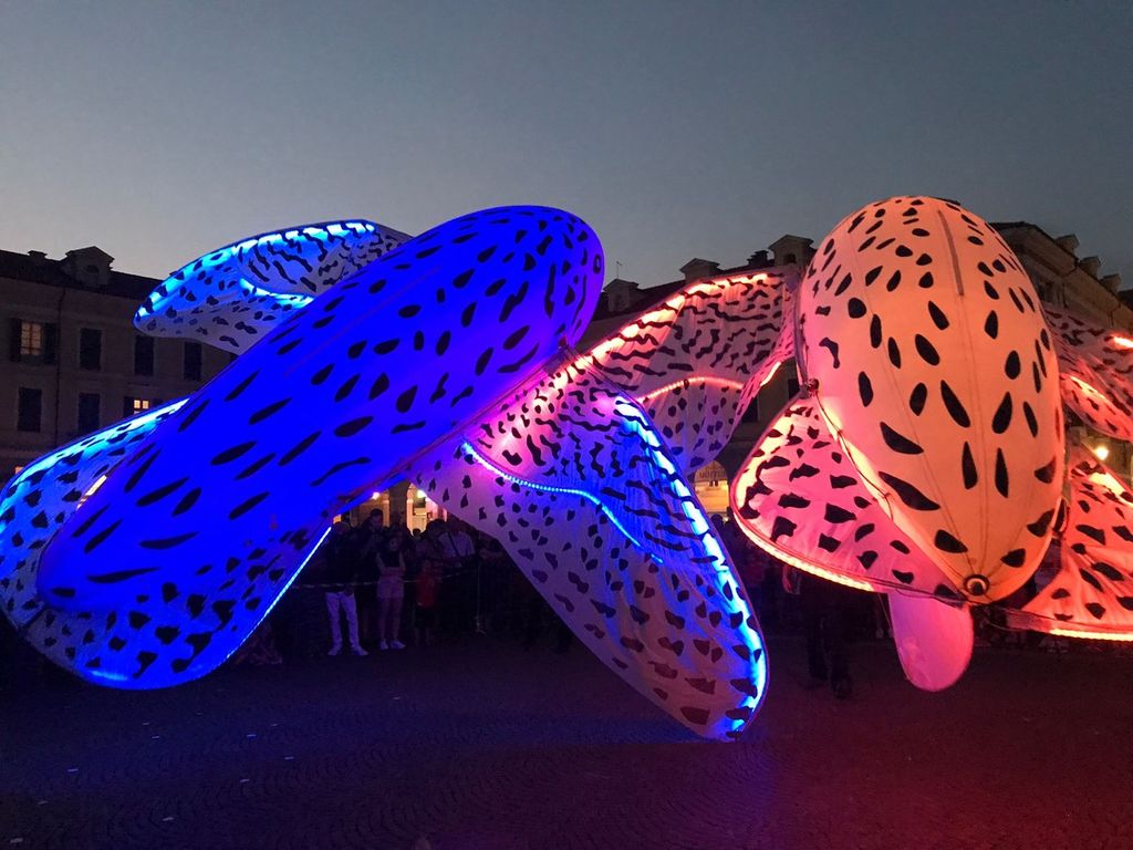 Suggestivo lo spettacolo luminoso itinerante, messo in scena dal gruppo di artisti “Porté par le Vent” accompagnato da musica dal vivo e già protagonista della Festa delle Luci di Lione, partito da Corso Dante per arrivare fino in piazza Galimberti e poi in via Roma.