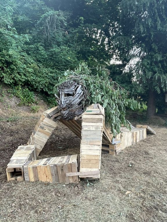 A questo punto del percorso, Fabio ha aiutato il gruppo nell’azione di sintesi ed è nata l’idea del gigante rilassato, sdraiato, a contatto con la natura. Per diverse settimane i giovani castellaresi hanno smontato pallet di recupero, creato pezzi e parti e costruito insieme “l’essere”.
