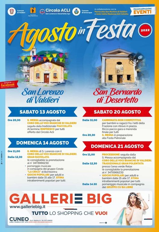 Il direttivo del Circolo Acli San Lorenzo e Desertetto Aps, giunto al suo settimo anno di attività sul territorio, propone il calendario dei festeggiamenti patronali organizzati in collaborazione con l'Unità Pastorale Valle Gesso, con i Comuni di Valdieri ed Entracque e con l'associazione amici del Santuario della Madonna del Colletto.