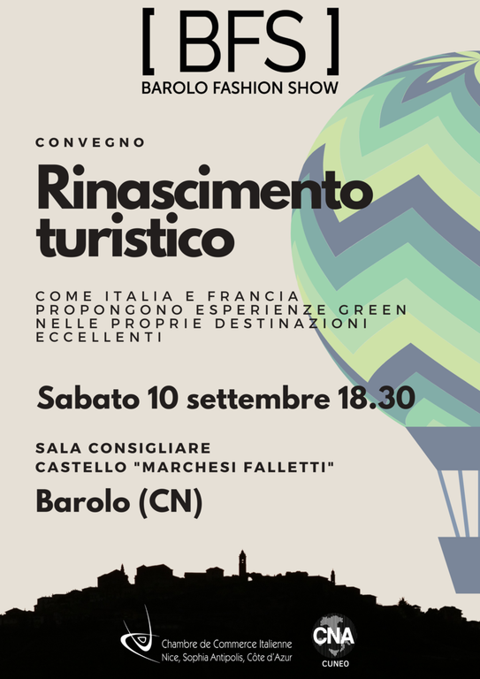 Dopo sei edizioni di successo, sabato 18 settembre torna il Barolo fashion show, Festival internazionale di moda, fotografia e design. IL BFS (Barolo fashion show) rende, per un weekend, la cittadina di Barolo famosa non soltanto per le sue eccellenze vitivinicole, ma anche per il fashion, l’arte e il turismo. Il calendario, fitto di eventi, racconta le eccellenze del “Made in Italy”, promuovendo la sinergia fra territori diversi e talvolta lontani fra loro. In questo dialogo fra arte, cultura e territorio, la Camera di Commercio Italiana di Nizza è stata invitata per raccontare, insieme a CNA Cuneo, come ha sviluppato il proprio canale di promozione turistica ed incrementato l'attenzione verso il Made in Italy in Francia. La Camera, infatti, svolge un ruolo cruciale nelle relazioni transnazionali e nella promozione delle eccellenze italiane, e grazie a dei progetti sviluppati appositamente per il mercato della Costa Azzurra, riesce ad essere un ponte di collegamento indispensabile per diverse realtà italiane che desiderano ampliare i loro orizzonti.