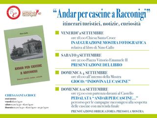 Nel corso dei festeggiamenti per il Settembre Racconigese, avverrà la presentazione del libro di Nino Gallo, dal titolo "Andar per cascine a Racconigi", con relativa Mostra fotografica sulle cascine racconigesi, nella Chiesa di S. Croce, da venerdì 2 a domenica 4 settembre e la domenica successiva 11 settembre avrà luogo la pedalata agro-gastronomica alla scoperta di alcune cascine tra le campagne racconigesi, con merenda finale sull'aia.