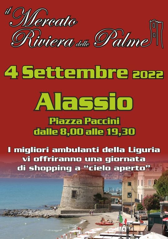 Tappa ad Alassio per il richiestissimo Mercato Riviera delle Palme, che domenica 4 settembre sarà in piazza Paccini dalle 8 alle 19.30. Un appuntamento atteso per l’opportunità e la garanzia di acquisti di alto livello in ogni settore presso i migliori ambulanti della Liguria.