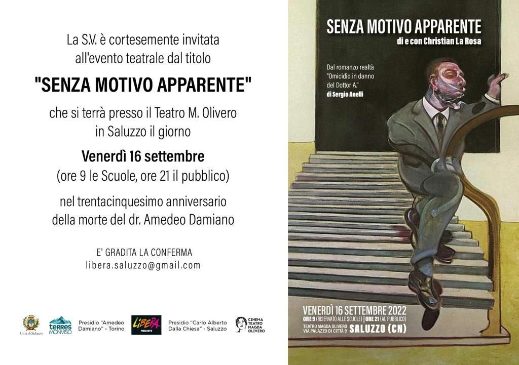 Tratto dal romanzo “Omicidio in danno del dottor A.”’ di Sergio Anelli, lo spettacolo-rievocazione “Senza motivo apparente” vede regista e protagonista lo straordinario attore Christian La Rosa.